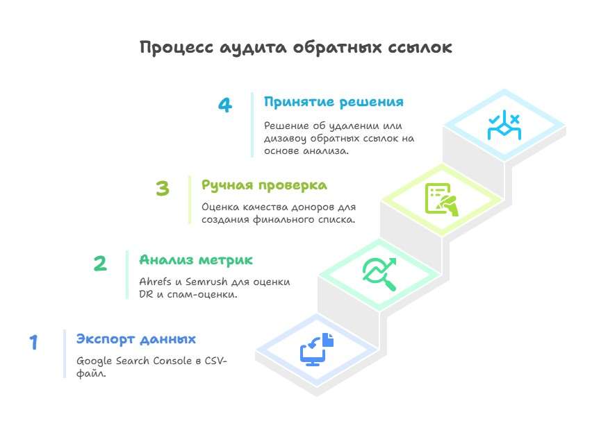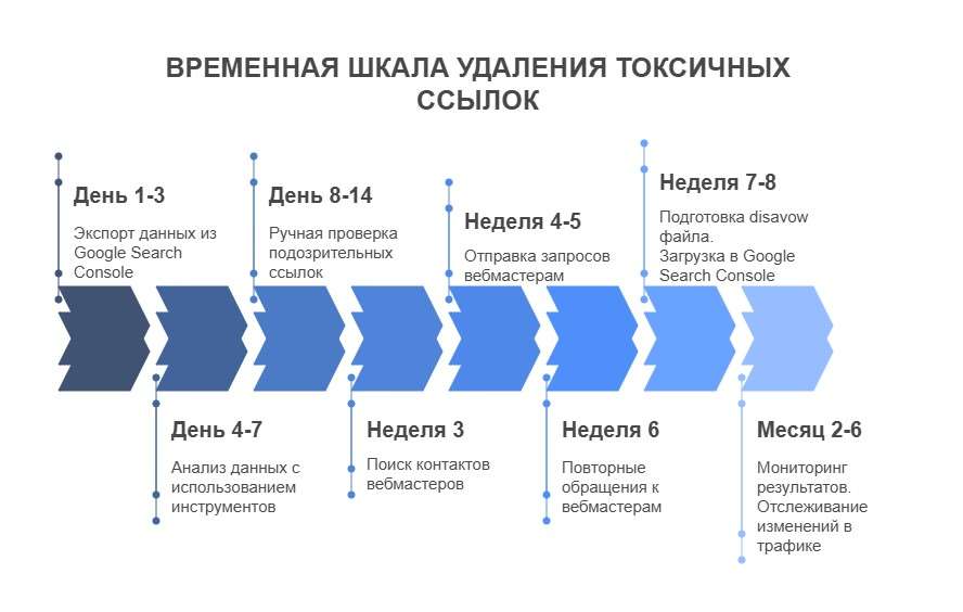 Процесс устранения токсичных обратных ссылок требует системного подхода и тщательного планирования. Первым шагом является контроль информации об обратных ссылках, где список подозрительных ресурсов создается на основе данных из различных источников: Google Search Console, специализированных инструментов для анализа бэклинков и собственного мониторинга сайтов.