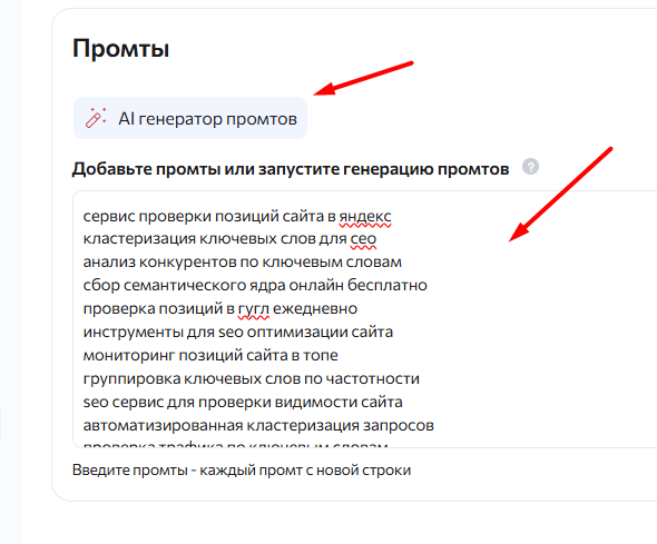 В данном блоке можно добавить промты (ключевые слова) самостоятельно – каждый с новой строки или сгенерировать промты, нажав на кнопку AI генератор промтов: