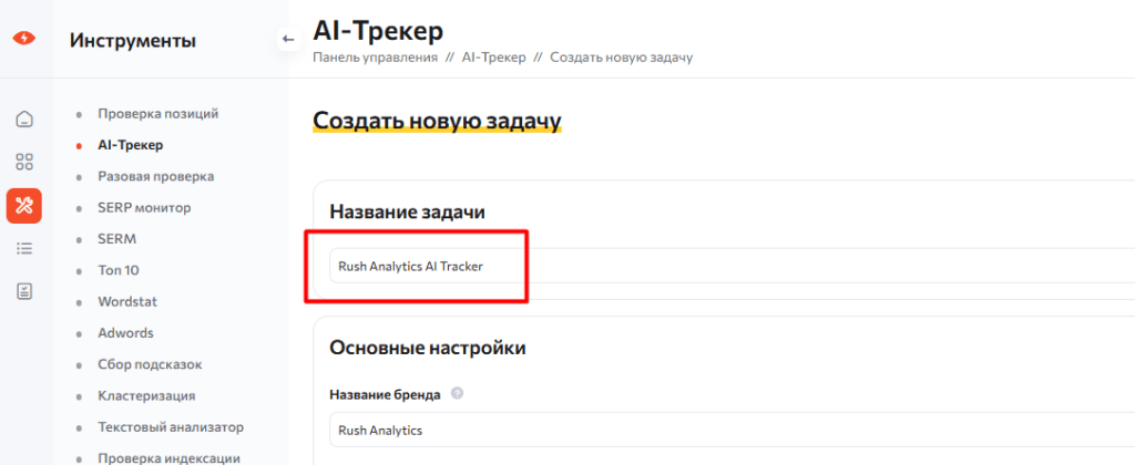 Вводите основное название бренда (или ключевое слово) по которому вы хотите собирать аналитику