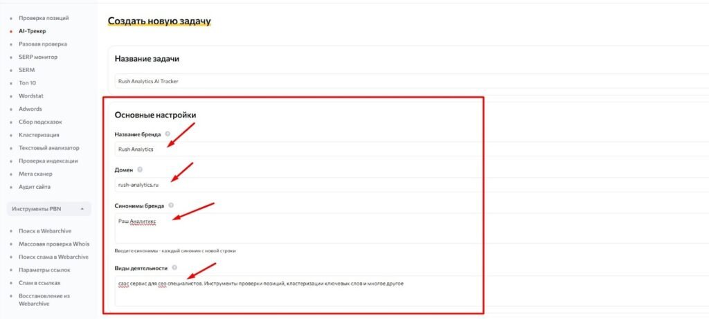 Вводите виды деятельности бренда или сайта – каждый с новой строки, которые AI должен учесть при генерации. Например: инструменты seo продвижения.