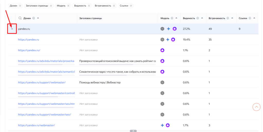 - Домен – часто используемые в ответах нейросетей домены (можно посмотреть детали).
