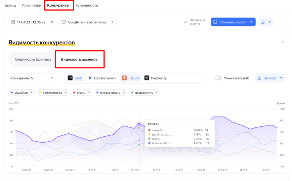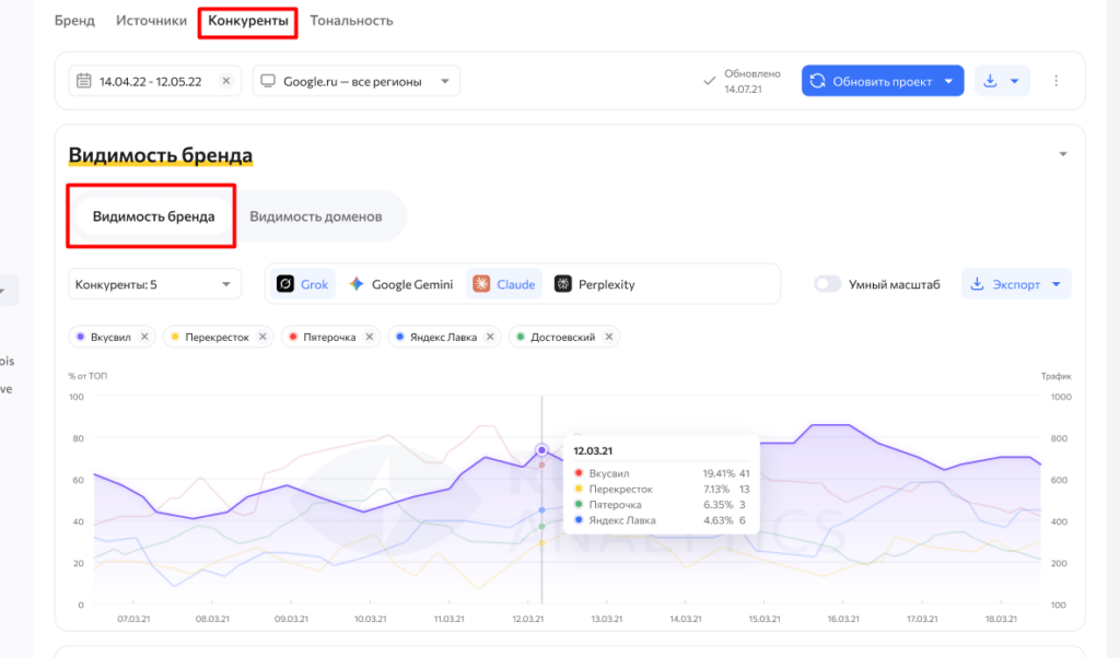 Есть историческая динамика – полная история изменений видимости за всё время мониторинга. Сравнивайте данные за разные периоды, выявляйте сезонность и влияние ваших маркетинговых активностей. Стройте графики видимости и доли упоминаний во времени.