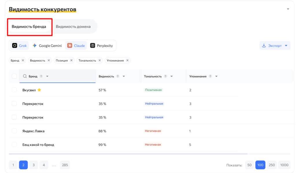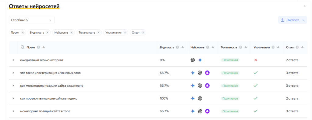 - Упоминания – были ли упоминания вашего бренда на этот промт.