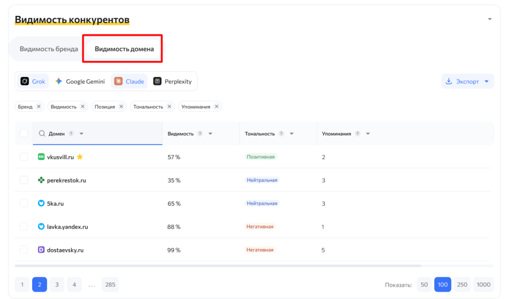 Тональность – средняя тональность домена по всем ответам нейросетей за последнюю дату сбора данных в указанном периоде.Упоминания – сумма упоминаний домена по всем ответам нейросетей за последнюю дату сбора данных в указанном периоде.