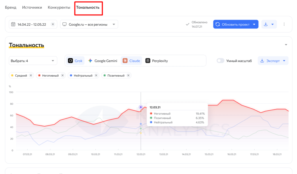 Тональность – Средняя тональность бренда по всем ответам нейросетей за последнюю дату сбора данных в указанном периоде.