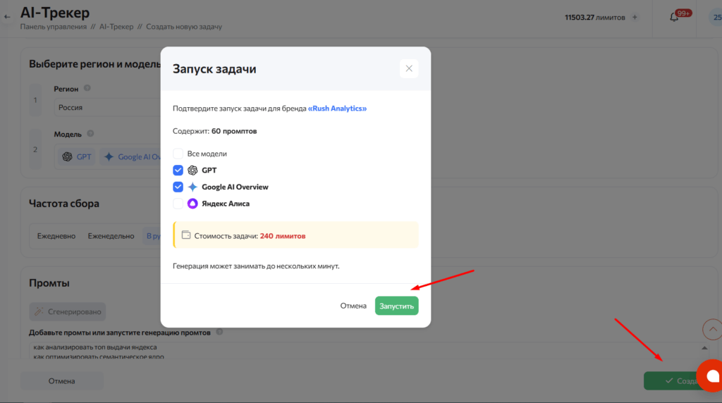 После того как вы заполните все обязательные поля, кнопка Создать станет активна и можно будет запустить задачу. Предварительно проверьте в поп-апе название задачи, настройки моделей и нажмите кнопку Запустить.