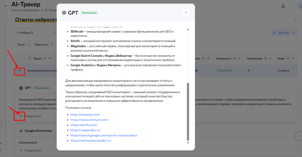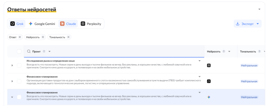 - Контролировать присутствие бренда в ответах нейросетей и понимать, упоминается ли компания по важным запросам.