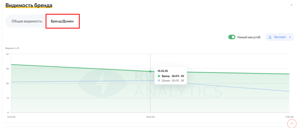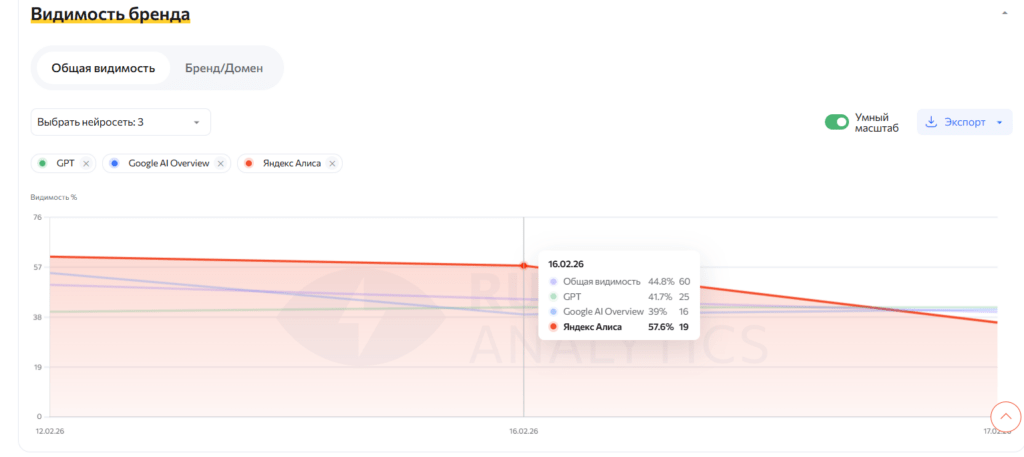 Видимость – средняя видимость домена по всем ответам нейросетей за последнюю дату сбора данных в указанном периоде.