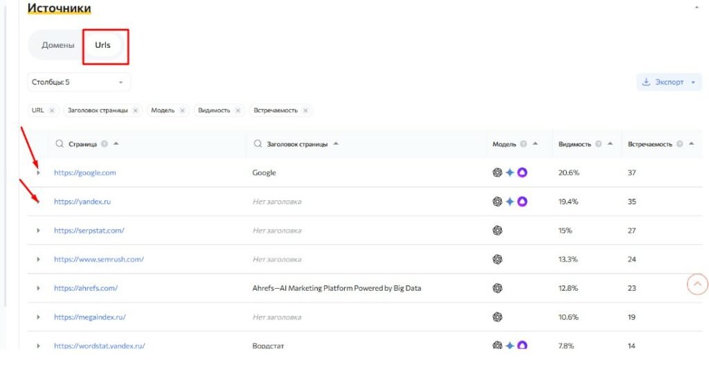 - Страница – домены, которые нейросети чаще всего используют как источники в своих ответах (можно посмотреть детали).