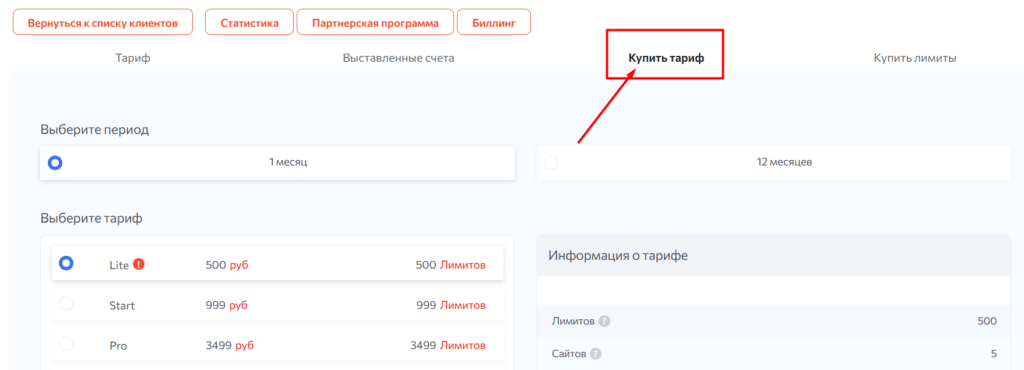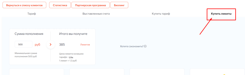 На вкладке Купить лимиты – покупка дополнительных лимитов, которые действуют в рамках тарифа и начисляются сразу.