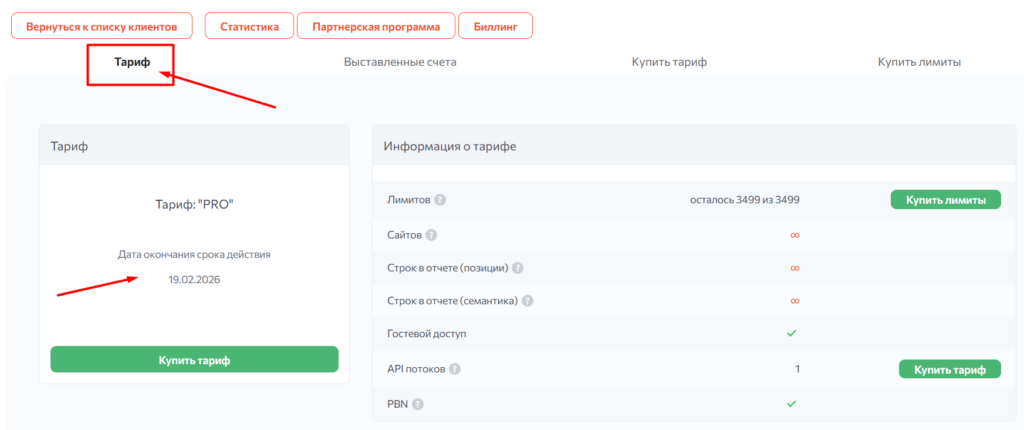 Также сразу активируется тариф с лимитами только после смены тарифного плана – когда новый тариф полностью отличается от старого (например, у вас был Start и вы перешли на PRO).