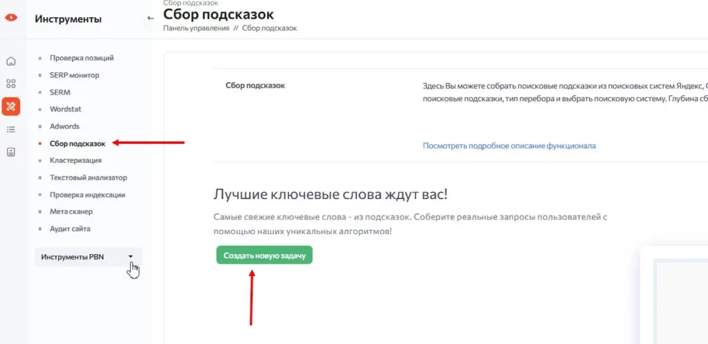 1. Создание задачи. Чтобы создать задачи, необходимо перейти во вкладку сбор подсказок и нажать “Создать новую задачу”