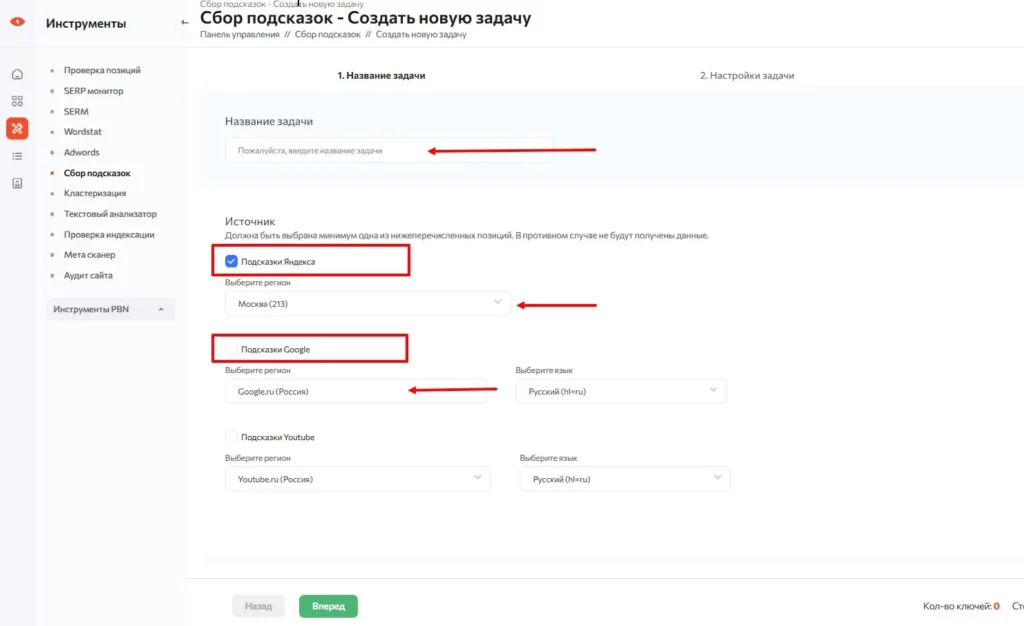 Далее мы указываем источник подсказок. Можно выбрать Яндекс, Google и/или Youtube.