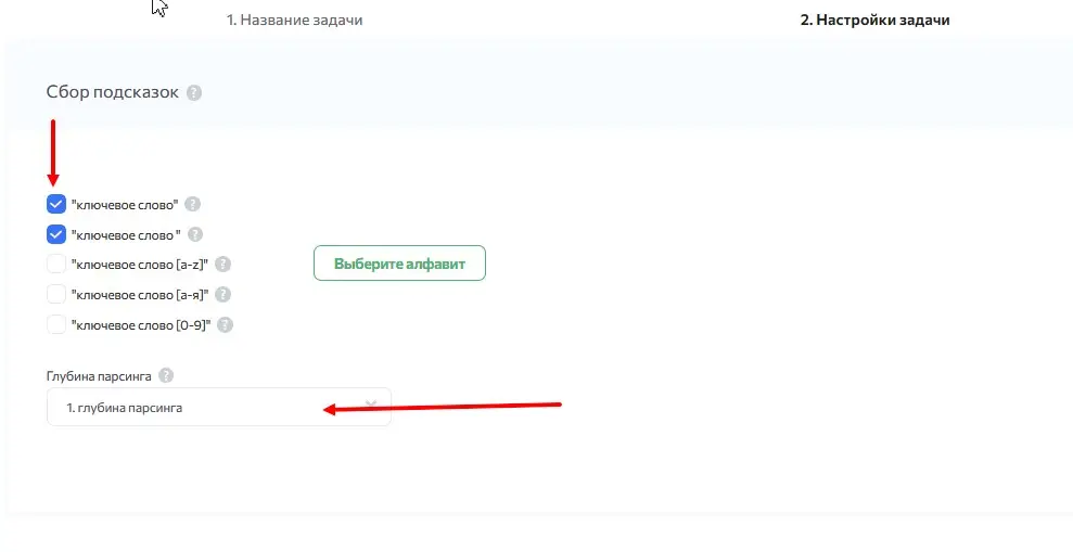Глубина парсинга: если вы выберите глубину парсинга 2 и более, то после сбора всех подсказок по вашим ключевым словам система соберет подсказки по всем новым ключевым словам(подсказкам, полученным на первом уровне).
