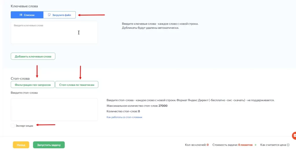 - Сбор данных – счетчик показывает, сколько ключевых слов обработано.